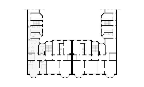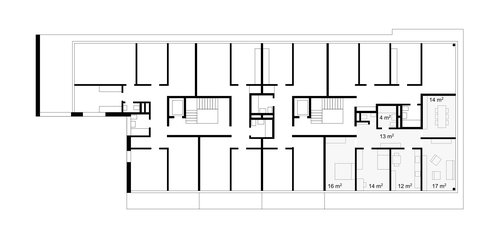 With minimal modification, the existing central corridor can be extended across and even beyond the entire building width. In conjunction with the additional kitchens and two barrier-free bathrooms at the ends of the corridors, which can be built as required, this creates an extremely flexible floor plan. The central corridor would become a communal and communicative space.