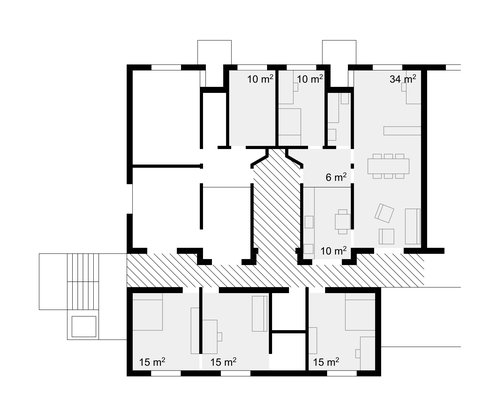 The building's structure allows for significant functional and spatial flexibility with minimal to moderate modifications to the floor plans. By introducing a central corridor, the proposed nuclei can freely access room clusters on the opposite side of the corridor. This setup enables a high degree of flexibility. A mix of different living arrangements, such as nucleus living, cluster living, student housing, or a boarding house format, is quite feasible within the existing structure with only slight modifications. This is made possible by the ability to rent out individual rooms separately while also defining spacious shared kitchens and bathrooms."