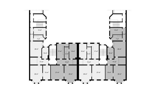 The original, very hierarchical residential concept, which can be assumed to be the basis for this floor plan layout, can no longer be considered relevant today. Therefore, a mixed scenario with shared flats and family living arrangements serves as a (hypothetical) assumption for the current occupancy of the existing floor plans. This means that the occupancy is already assumed to be comparatively efficient, compared to an equally plausible occupancy of only 2-3 people per flat.
