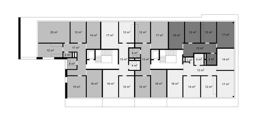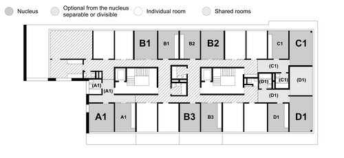 With minimal modification, the existing central corridor can be extended across and even beyond the entire building width. In conjunction with the additional kitchens and two barrier-free bathrooms at the ends of the corridors, which can be built as required, this creates an extremely flexible floor plan. The central corridor would become a communal and communicative space.